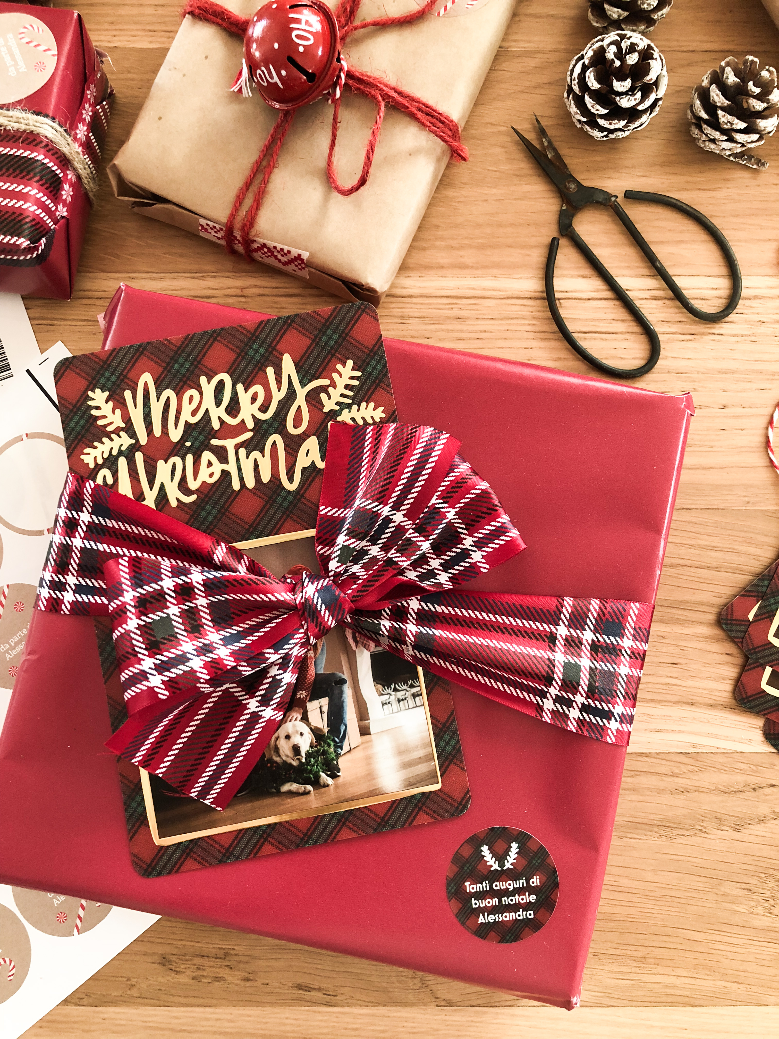 Per questo Natale mi sono munita di carta regalo bordeaux e tartan, nastri tartan, spago, pigne, campanelli ecc ecc.