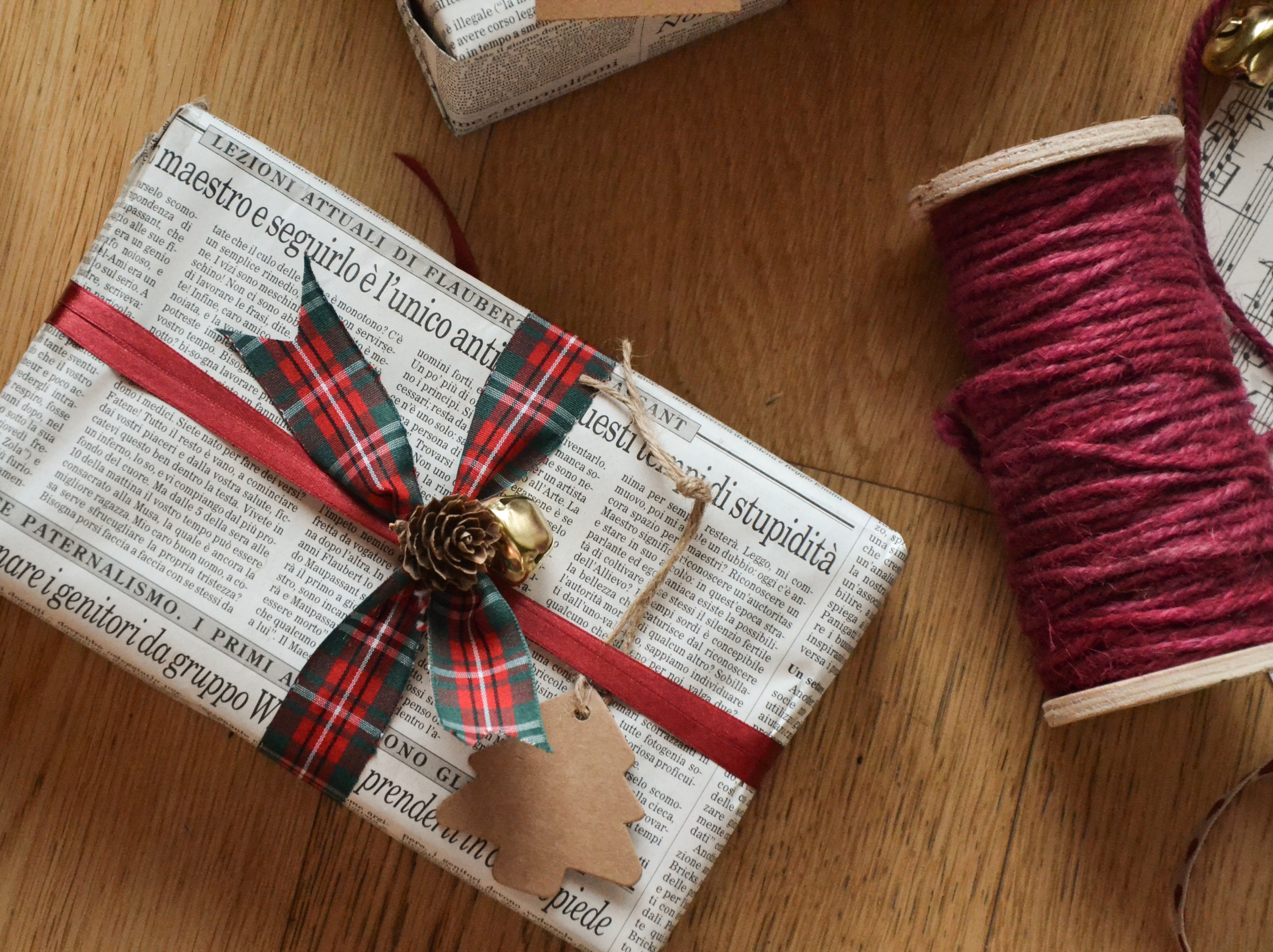 Come ogni anno, non ho potuto non comprare (da Ikea) un rotolo di carta pacco perché si sa, fa molto “country”, ma non solo, quest’anno ho preso anche rotoli di carta brillantinata color oro (Tiger), dei fogli di carta reppresentanti degli spartiti musicali (Amazon) e…. udite udite, ho utilizzato anche dei fogli di un quotidiano per i miei pacchetti. Mattino, repubblica, gazzetta, qualsiasi quotidiano purché sia in bianco/nero e senza (o con poche) immagini.