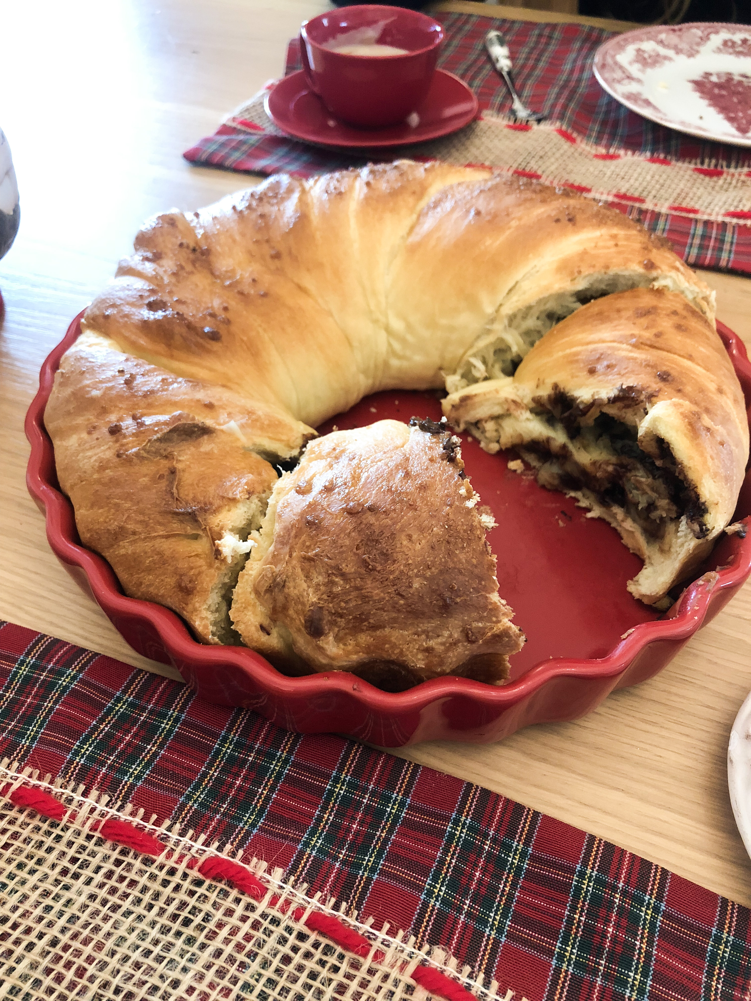 Lavorate (a mano o con la planetaria, con gancio ad uncino) la farina con le uova, il burro a temperatura ambiente, poi aggiungete sale zucchero e aromi. Aggiungete l’acqua ( a temperatura ambiente) e il composto di acqua e lievito. Lavorate l’impasto fino ad ottenere un composto morbido ed omogeneo. Conservate in un recipiente e copritelo con un canovaccio , tenetelo in un posto caldo ( magari nel forno spento con luce accesa) per 2ore o più (fino a quando non raddoppia di dimensione). Quando avrà raggiunto il doppio della sua dimensione iniziate a lavorarlo su un piano e stendetelo (come se voleste fare una pizza) aggiungete all’interno la farcituta che preferite, e chiudetelo nuovamente come se voleste fare una girella. Adagiatelo in una pirofila tonda, e lasciate lievitare ancora per un po’ di ore. (io lo lascio fuori a lievitare tutta la notte e al mattino lo inforno). Spennellatelo con latte ( o uova, o panna) e cospargetelo con zucchero. Infornate in forno statico preriscaldato a 180º per 25 minuti circa ( a seconda del forno)